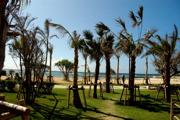 ホテルからビーチに抜ける。さすがに沖縄一高いビルだ。手前にあるのは何だろう?ビーチ内でスケートボードをしている少年たちがいた。彼らは字が読めないわけがない。きっと無視して遊んでいるのだ。